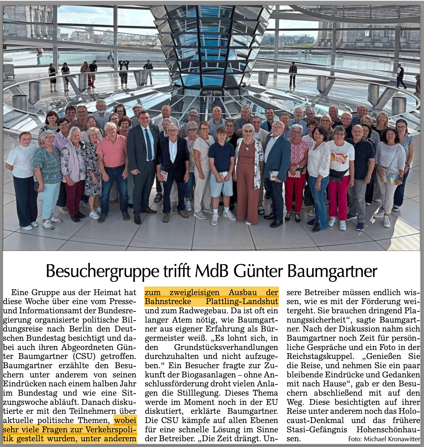 16.09.2025, Dingolfinger Anzeiger: Besuchergruppe trifft MdB Günter Baumgartner