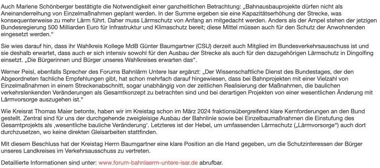 Vertreter der CSU hatten nicht an diesem Termin teilgenommen. Stattdessen gab es im Nachgang mit den CSU-Mandatsträgern der Region und dem Forum Bahnlärm Untere Isar einen gesonderten Termin.