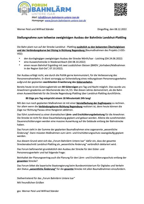 Das Forum Bahnlärm Untere Isar unterstützt grundsätzlich das Projekt, fordert aber gleichzeitig einen voll umfänglichen Lärm- und Erschütterungsschutz entlang der Strecke ein. Ein wesentlicher Schritt hierzu wäre die Definition des o. g. Bahnprojekts als „wesentliche Änderung“ gemäß 16. BImSchV (16. Verordnung zur Durchführung des Bundes-Immissionsschutzgesetzes).