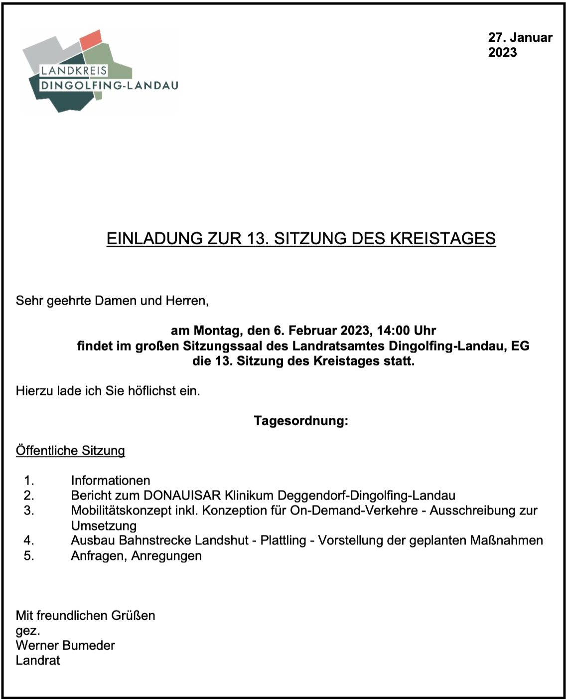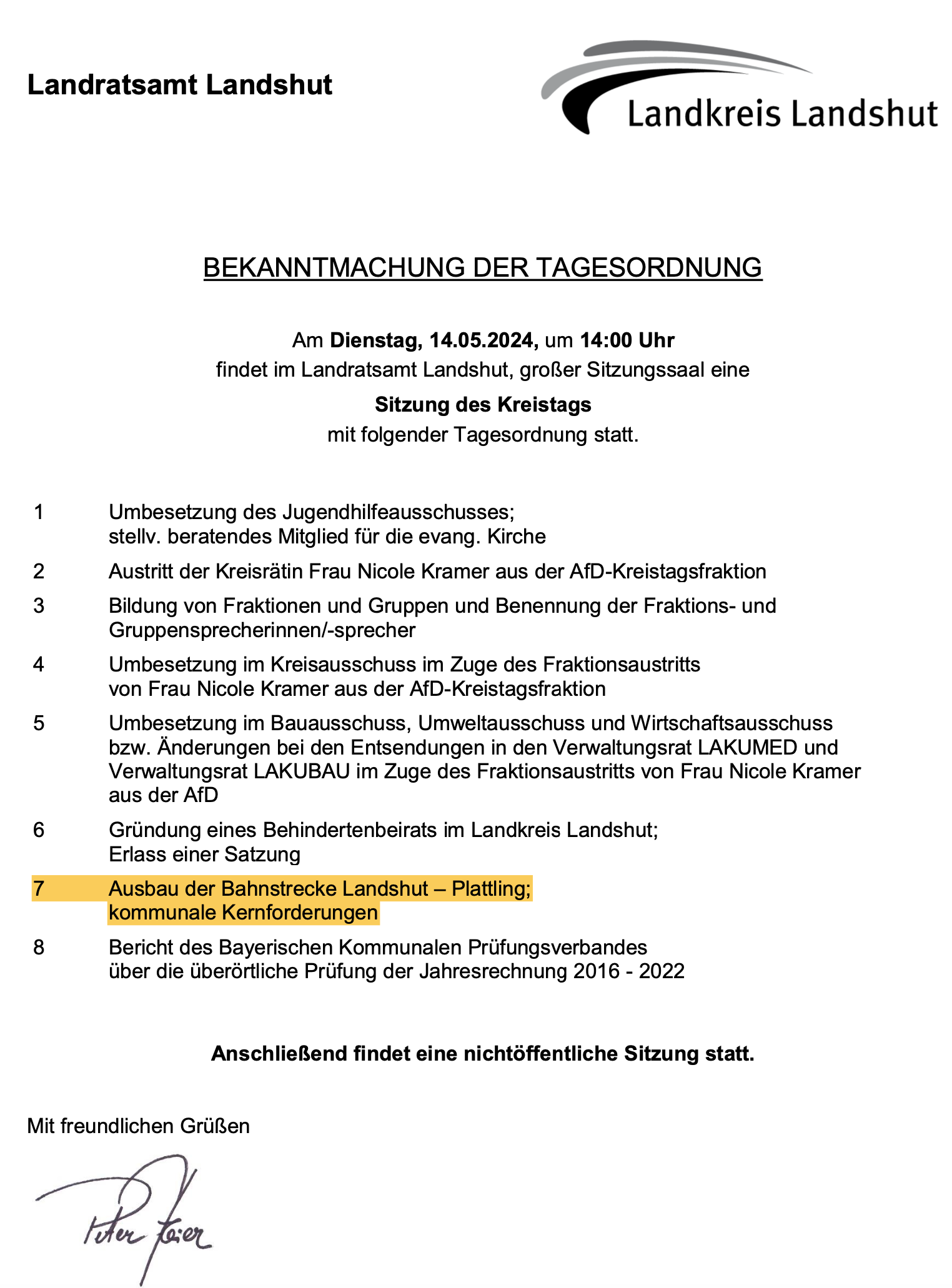 03.05.2024, Einladung zum Landshuter Kreistag am 14.05.2024