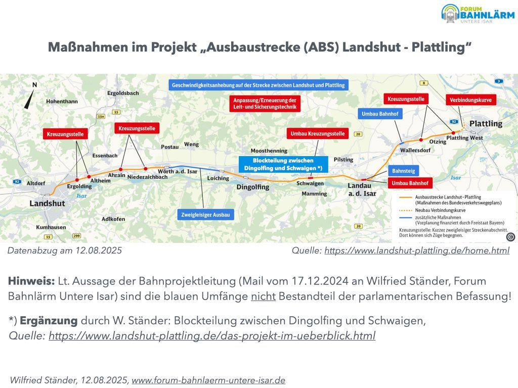 Auf Nachfrage hat die Bahn-Projektleitung erklärt, dass im Rahmen der parlamentarischen Befassung im Bundestag NICHT alle Baumassnahmen behandelt werden. Z. B. der zweigleisige Ausbau zwischen Wörth und Loiching ist Bestandteil des Projekts Deutschlandtakt und wird nicht im Bundestag behandelt.