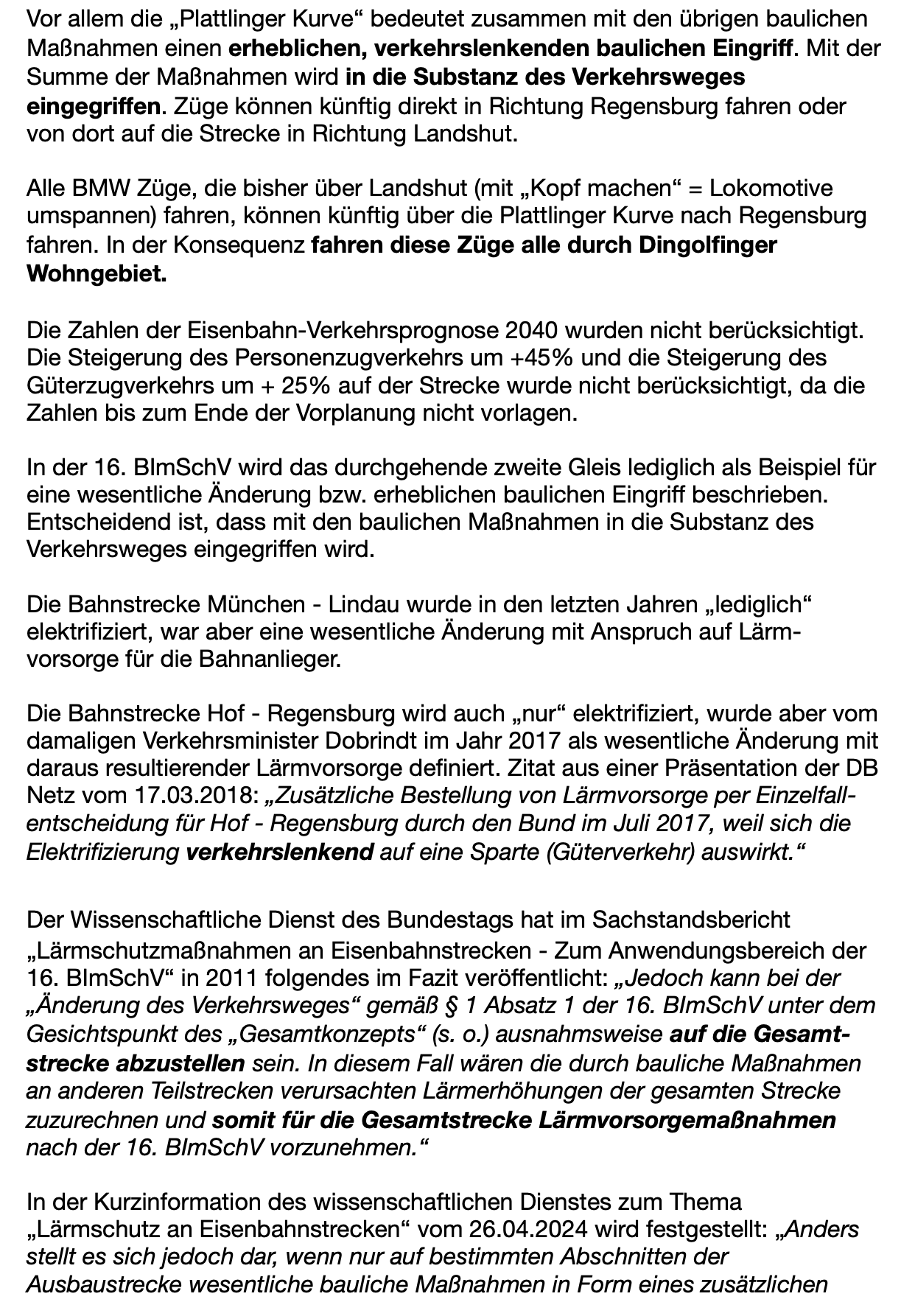 Wenn nur in jedem Baubereich Lärmschutz errichtet wird, dann würden die Ortsdurchfahrten z. B. in Dingolfing und Landau ohne Lärmschutz bleiben. Die Baumaßnahmen dienen ausschließlich der Steigerung der täglichen Zugfahrten. Allein die neue Kurve in Plattling wird dafür sorgen, dass sich der BMW-Güterzugverkehr von Dingolfing nach Plattling praktisch verdoppelt. Ohne Lärmschutzmaßnahmen ist das nicht akzeptabel! Wir fordern daher die Baumaßnahmen als "wesentliche Änderung" zu definieren und damit die Lärmvorsorge umzusetzen.
