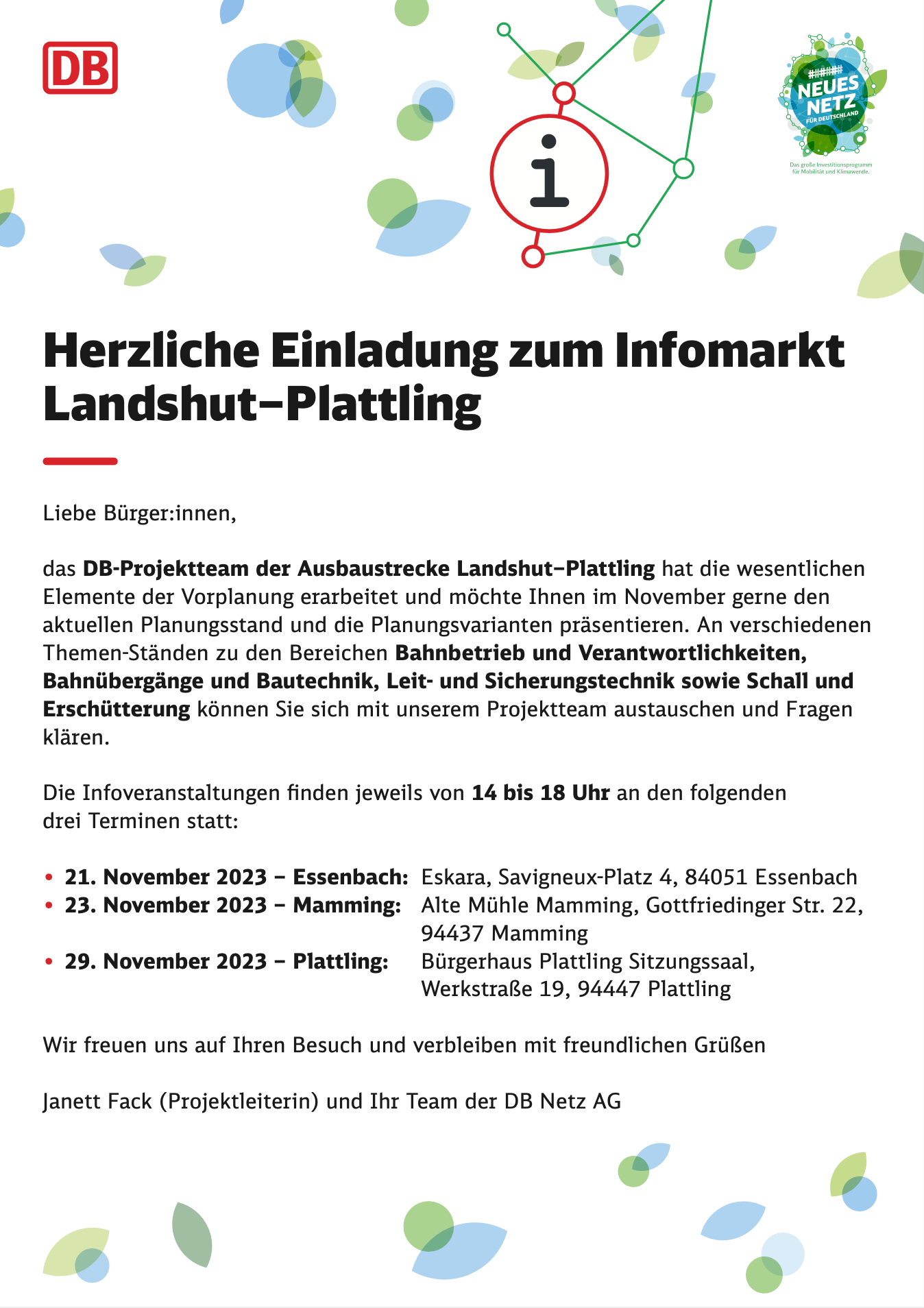 Von der Projektleiterin der DB, Janett Fack, haben wir eine Einladung zum Infomarkt erhalten. Diese Einladung geht an alle Bürger entlang der Strecke. Einige Gemeinden haben diese Einladung bereits auf ihrer Homepage eingestellt. In den Tageszeitungen erfolgt die Veröffentlichung noch.