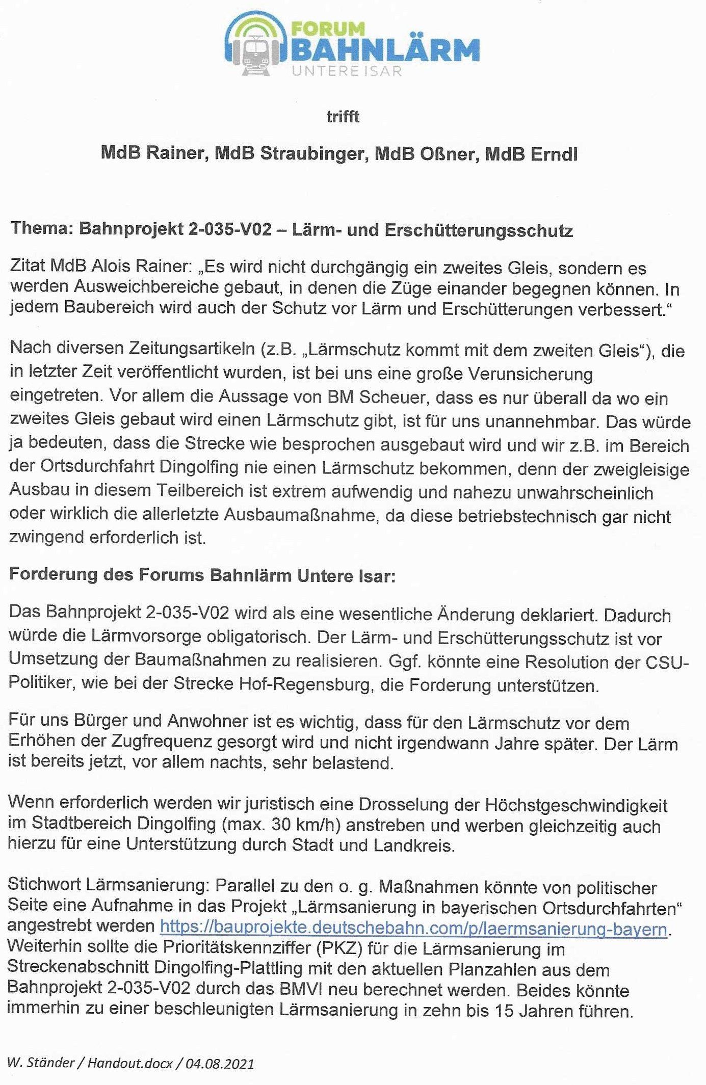 Am 23.03.2021 konnten Susanne Steinkirchner und Wilfried Ständer in einem Gespräch mit dem Wallersdorfer Bürgermeister Franz Aster und dem Geschäftsleiter Josef Greßmann ihre Sicht auf das Bahn-Projekt 2-035-V02 vorstellen. Vor allem die Bewertung des zunehmenden Bahnlärms, besonders in der Nacht, stand dabei im Vordergrund. Nach Ansicht der Vertreter des Forums wird das Thema Lärmschutz keine bzw. eine untergeordnete Rolle spielen. Dies lässt sich u. a. sehr leicht aus dem Interview des MdB Alois Rainer (Mitglied des Verkehrsausschusses im Bundestag) vom 05.02.2021 bei idowa+ herauslesen. Dort heißt es, dass nur "in jedem Baubereich auch der Schutz vor Lärm und Erschütterungen verbessert wird“.